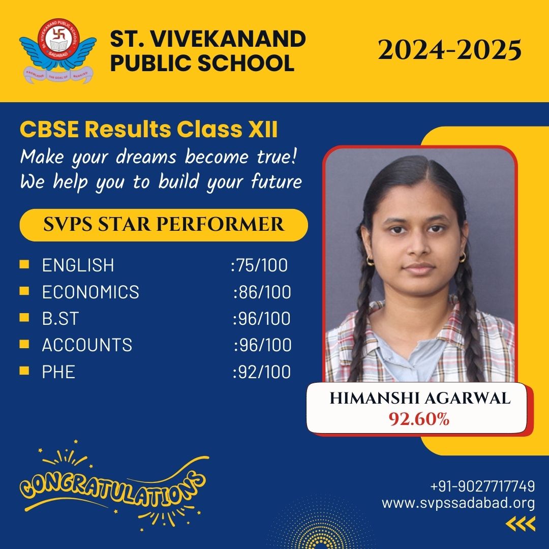 St. Vivekanand Public School, Sadabad, A Premier Educational Institute In The Uttar Pradesh, Endeavours Towards A Holistic, All Round Development And Academic Excellence. At ST Vivekanand PUBLIC SCHOOL We Provide Children With A Platform Where They Can Dare To Realize Their Dreams. We Respect The Individual Abilities Of Children And Motivate Them To Explore Their Soul. Our Progressive Curriculum Provides Children With An Opportunity To Grow Without Boundaries. We Continuously Research And Enrich Our Curriculum To Meet The Requirements Of Changing Times. Great Teachers, A Great Learning Environment, Great Infrastructure. What More Could One Ask For!.